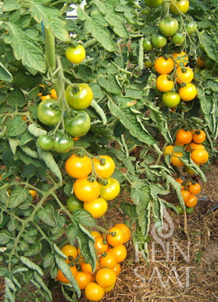 mittelstark wachsende Stabtomate, goldgelb, mittelgroß, geringe Säure