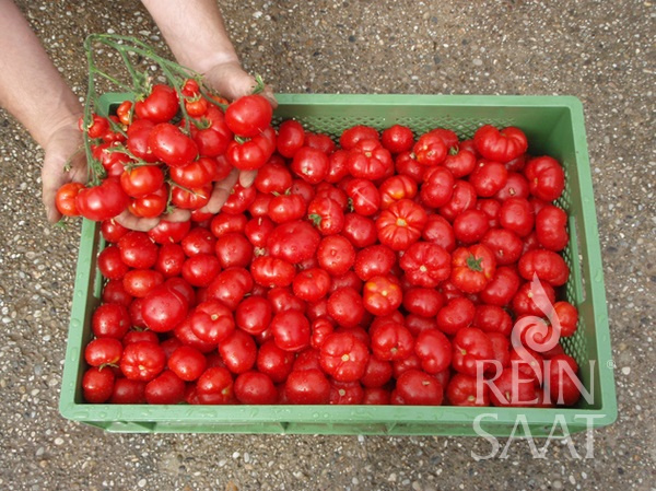 Sehr reichtragende Fruchttrauben mit roten, flachrunden, kleinen bis mittelgroßen Früchten