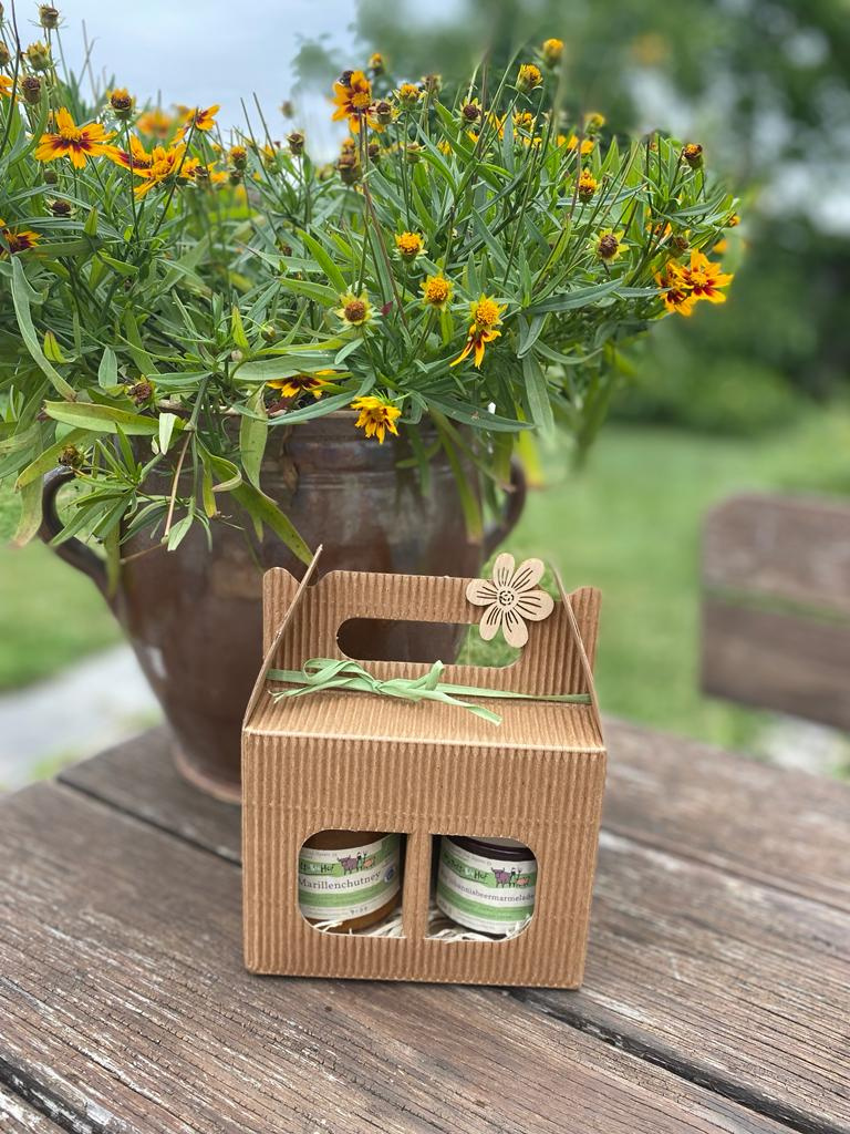 Dieser Geschenkkarton wurde mit unserem Bio Chutney und unserer Bio Marmelade befüllt!