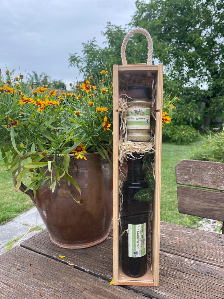 Diese Holzbox ist mit unseren Bio Kürbiskernöl sowie unseren Bio Kürbiskernsalz gefüllt.
