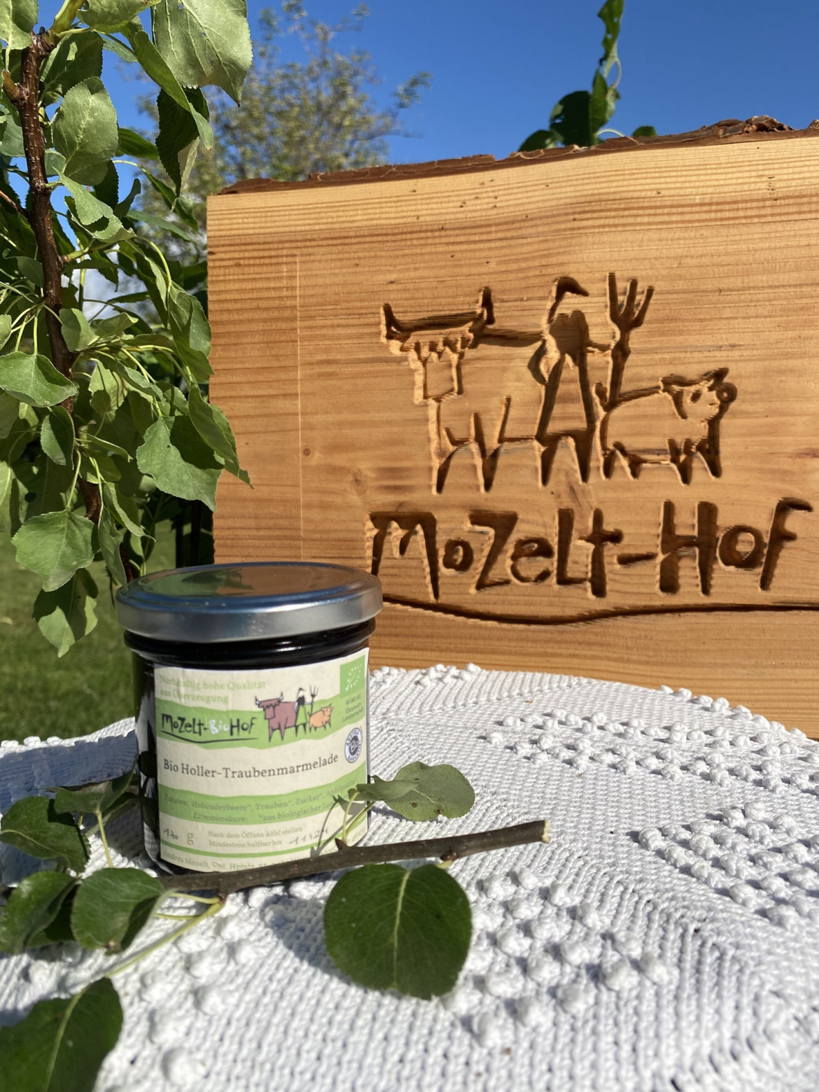 Die Holler Traubenmarmelade ist unsere besondere Marmelade. Sie wird aus den wertvollen Hollerbeeren und süßen Trauben hergestellt.