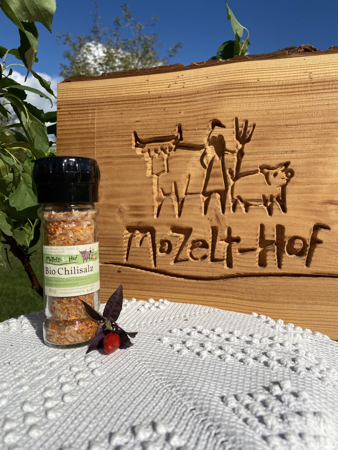 Dieses Bio Chilisalz in der Mühle beinhaltet Steinsalz und unsere handgeernteten Chilis
