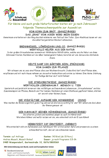 Wir möchten Kindergarten- und Schulkinder für Wildkräuter, Getreide, Gemüse, Bienen und Hühner begeistern. Wir vermitteln Wissen über die Schätze der Natur und stärken das Bewusstsein für gesunde Lebensmittel, spielerisch und ressourcenstärkend. Wir passen unser Programm an die jeweilige Gruppe an.